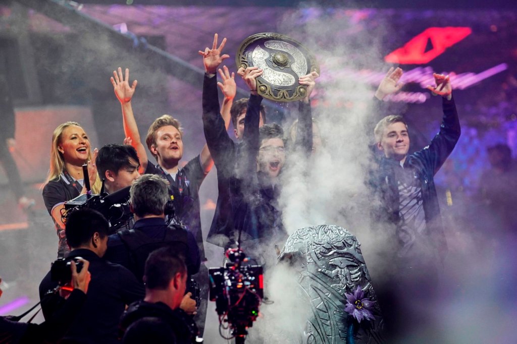 Sebastien “Ceb” Debs (C) of team OG holds the winner’s trophy as the team wins the Dota 2 eSports Best of 5 final match during the International Dota 2 Championships in Shanghai on August 25, 2019. (Photo by STR / AFP) / China OUT (Photo credit should read STR/AFP/Getty Images)
